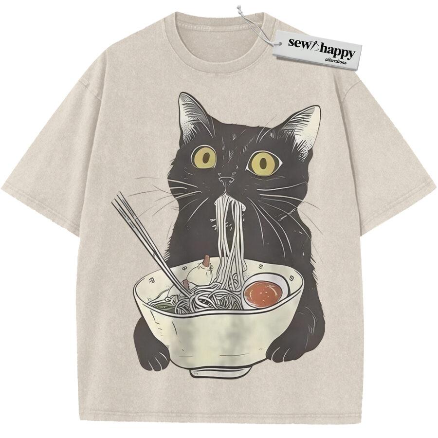 Wash Tee Ramen Cat Shirt, Japanese Streetwear Shirt, Vintage T-Shirt