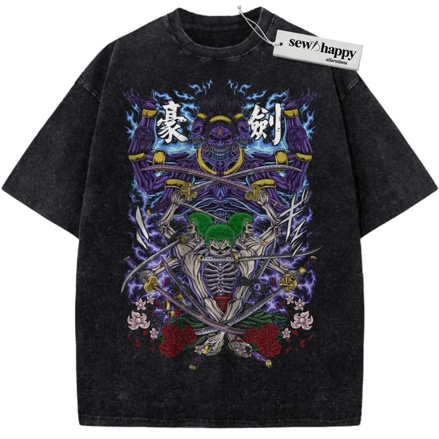 Wash Tee Skeleton Roronoa Zoro Shirt, One Piece Shirt, Anime Shirt, Vintage T-Shirt