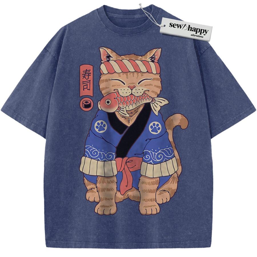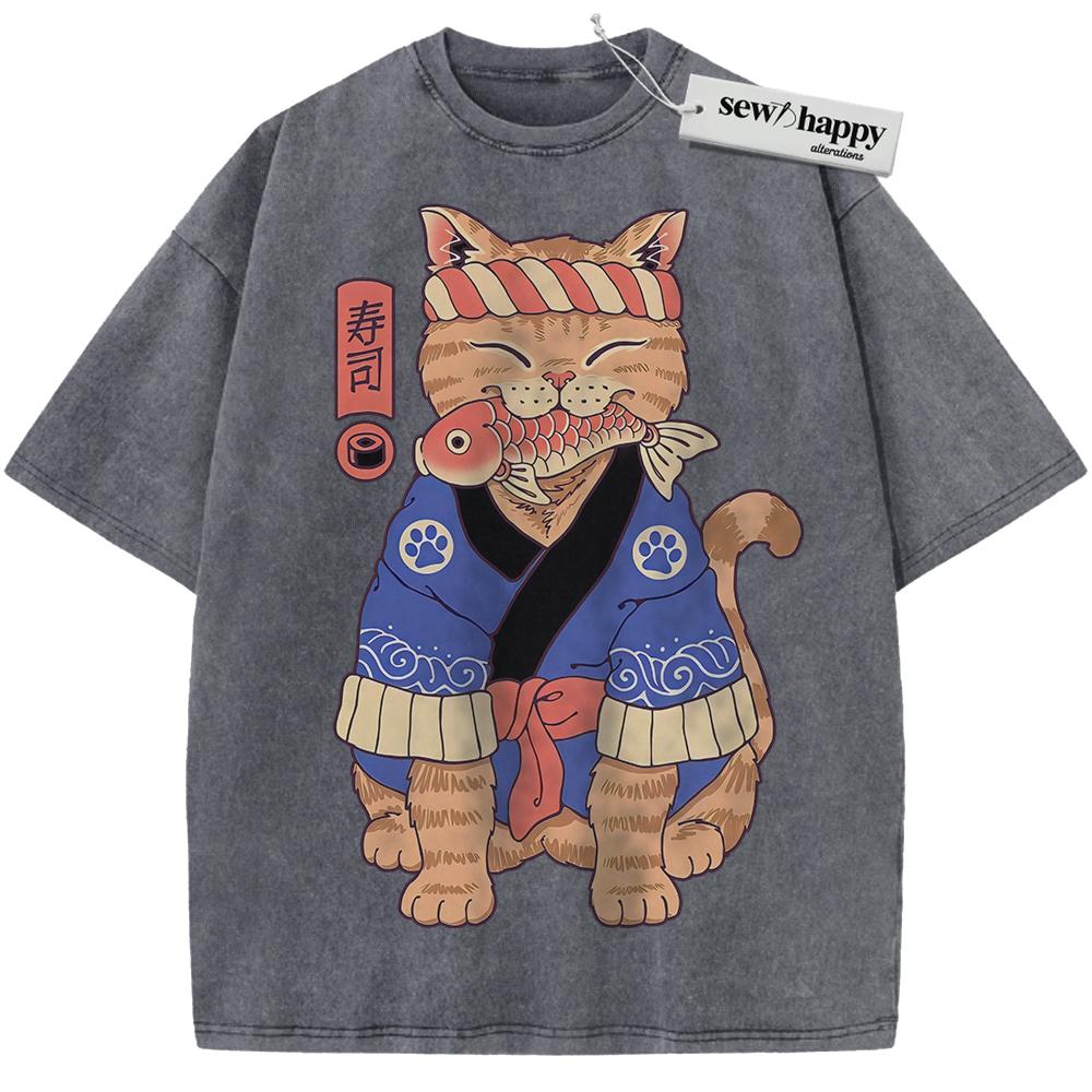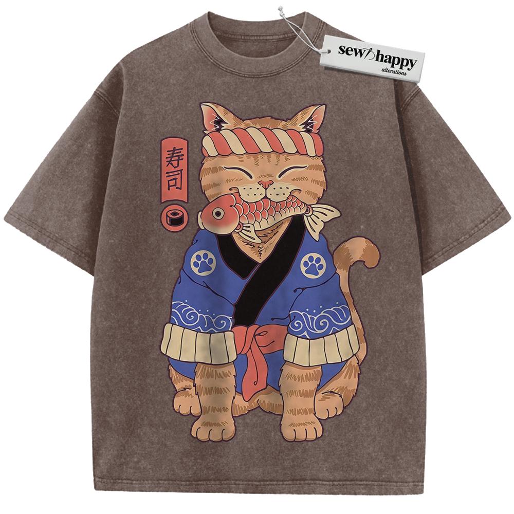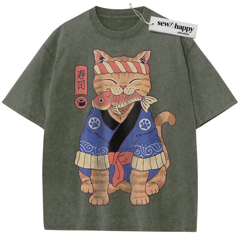 Wash Tee Sushi Cat Shirt, Japanese Streetwear Shirt, Vintage T-Shirt