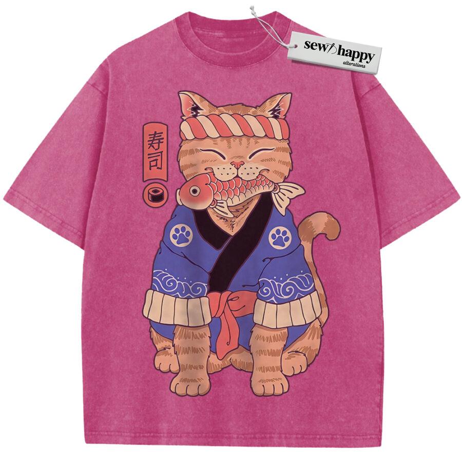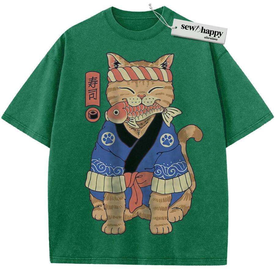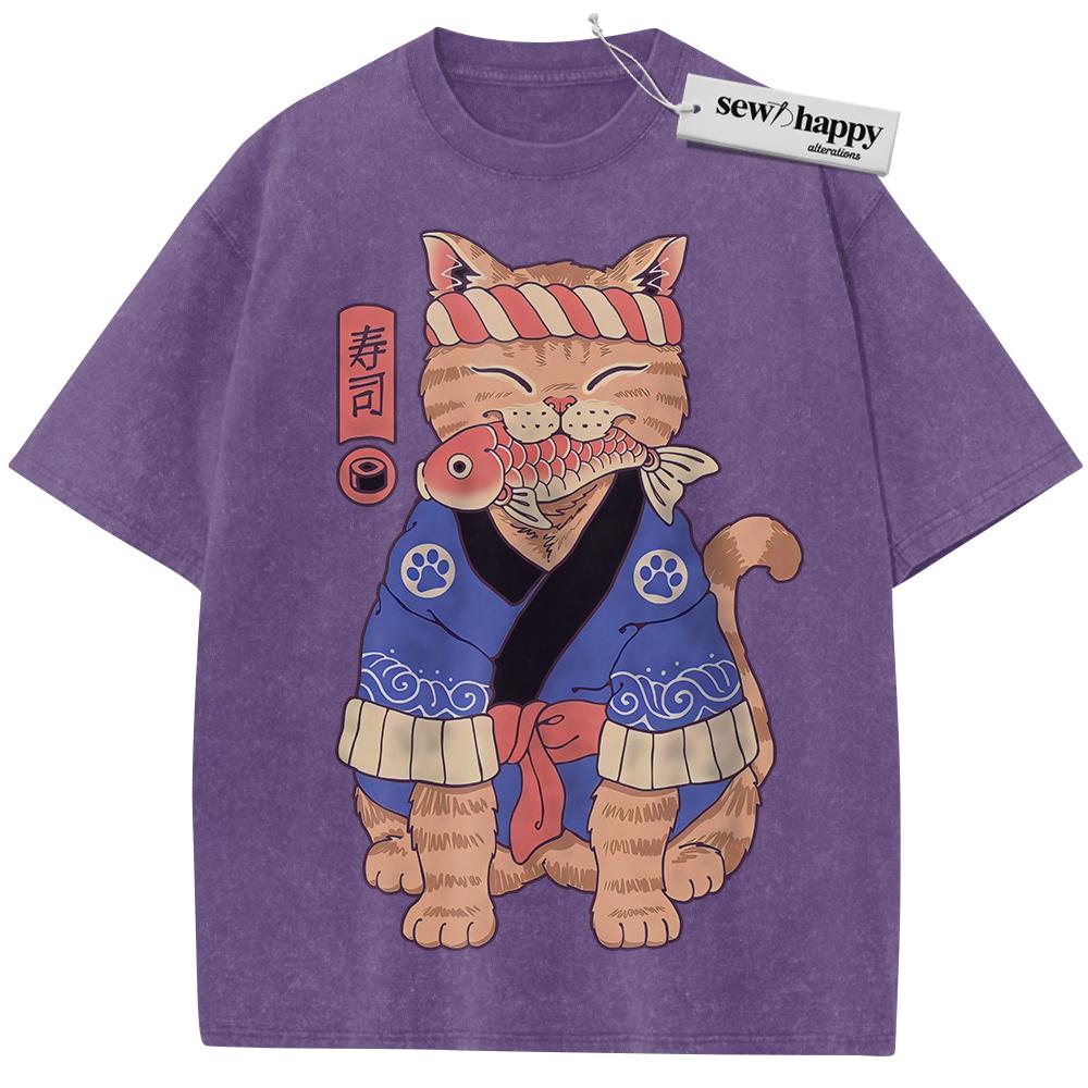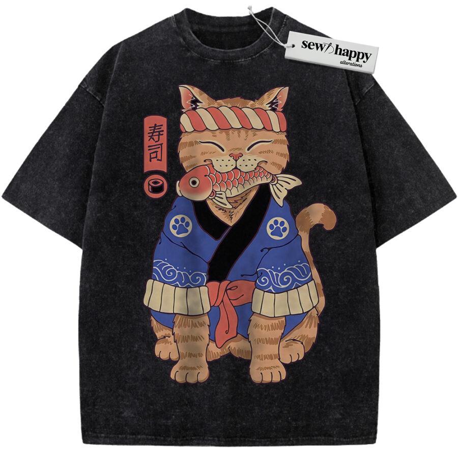 Wash Tee Sushi Cat Shirt, Japanese Streetwear Shirt, Vintage T-Shirt